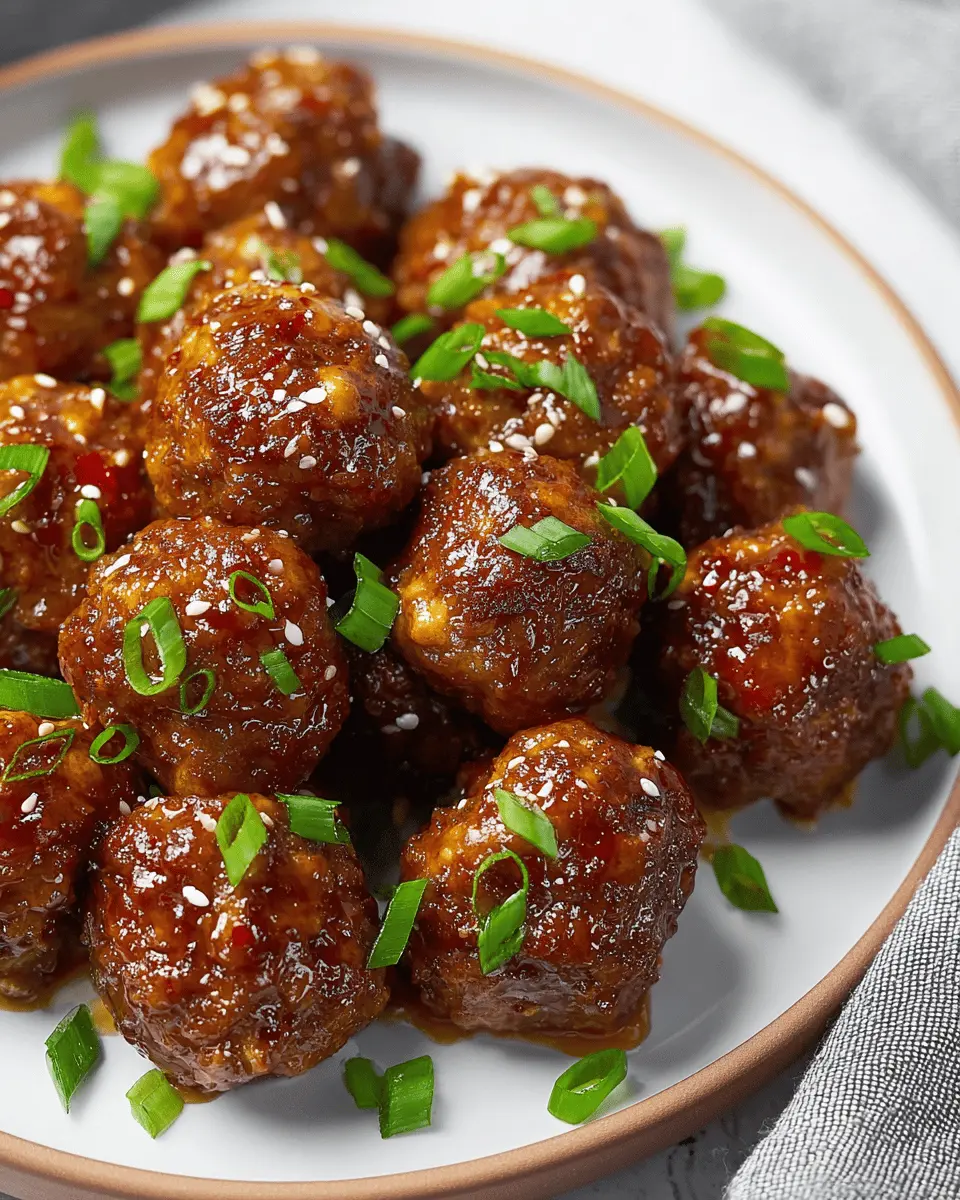 - Once the meatballs are cooked, sprinkle them with diced green onions and sesame seeds before serving.