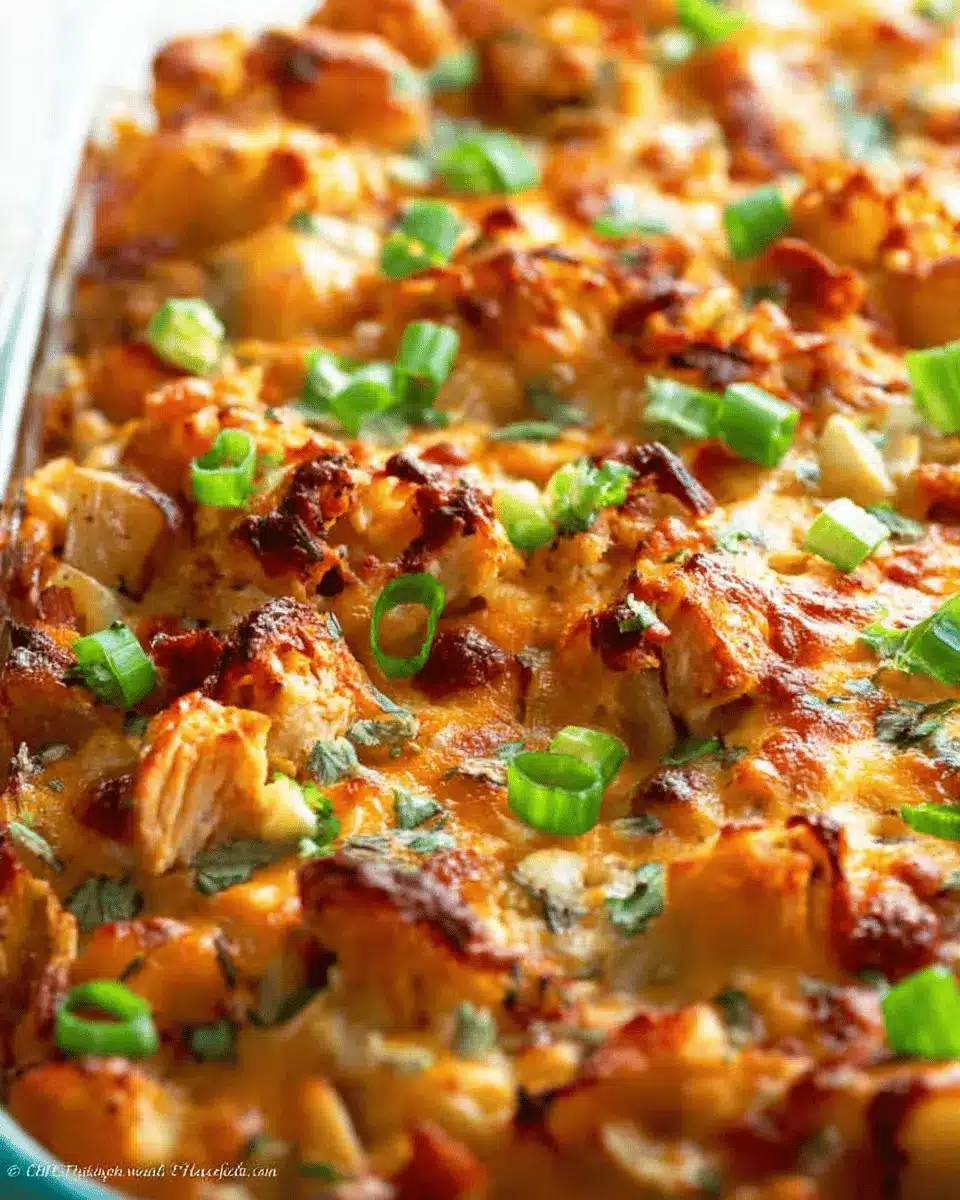 While that’s baking, mix together your toppings—shredded cheddar cheese, cooked turkey bacon, and sliced green onions. When the chicken is done, sprinkle the topping over everything and return it to the oven for an additional 5-10 minutes until the cheese is bubbly and melted.