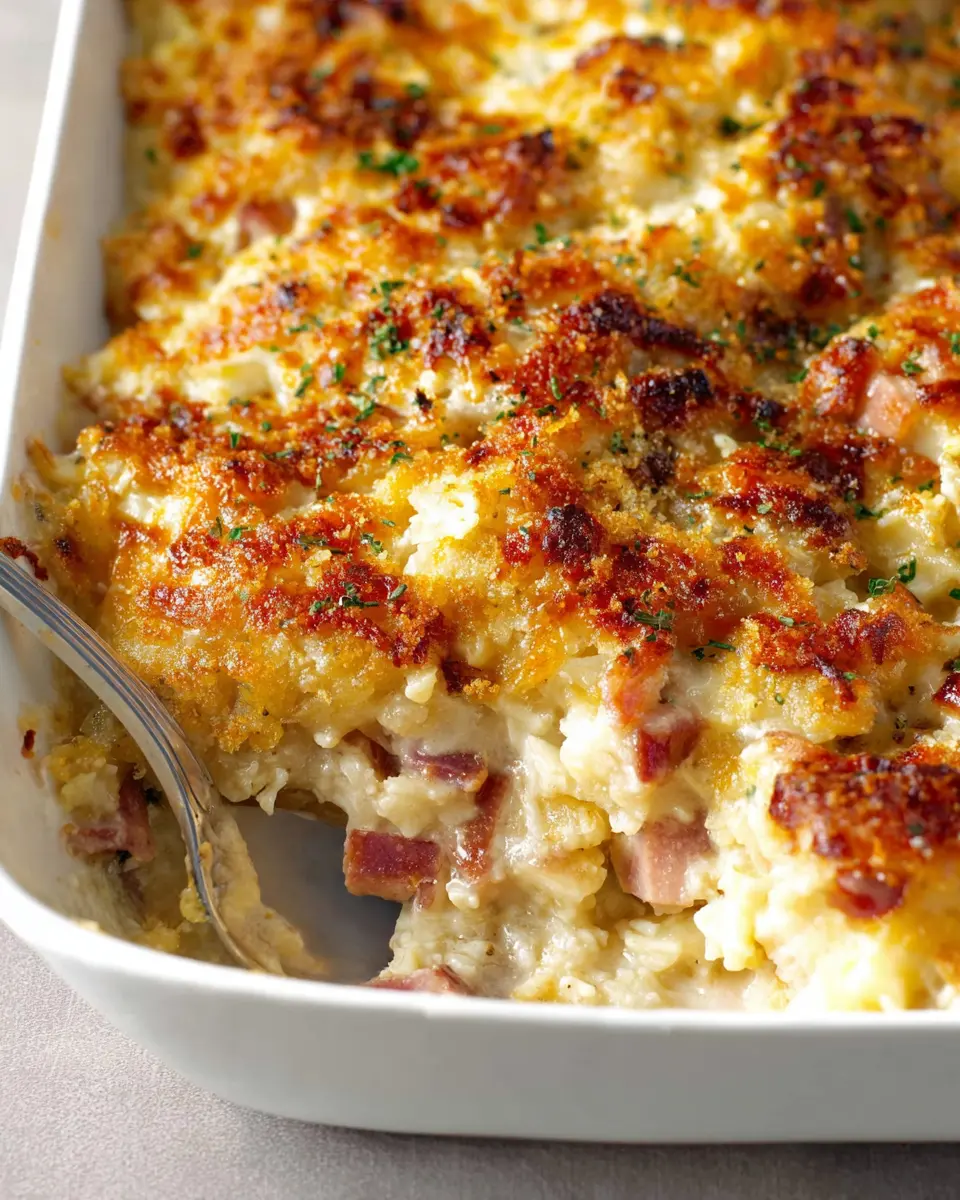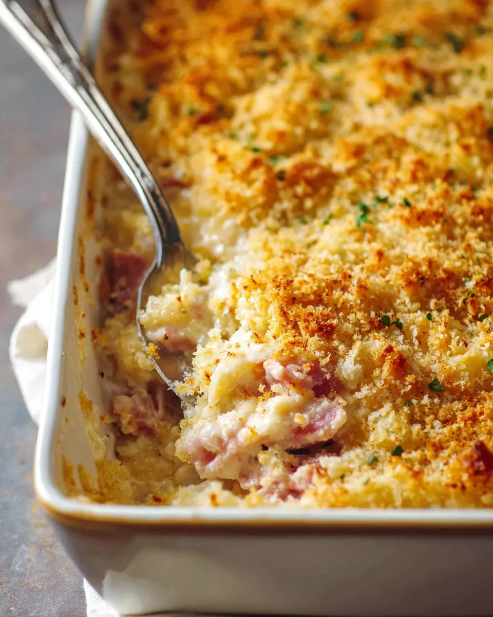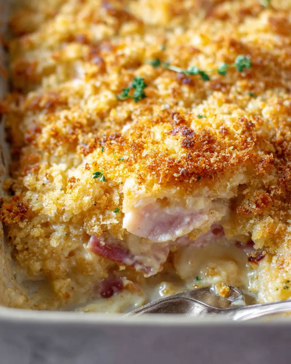 Now comes the fun part! Pour the creamy cheese sauce evenly over the chicken and chicken ham layers, ensuring it's all covered. Finally, sprinkle your buttery Panko topping generously on top. Bake the casserole uncovered for about 30-35 minutes, until the breadcrumbs are golden brown and the casserole is bubbly. Don’t forget to let it cool for about 5-10 minutes before diving in—it’ll be worth the wait!