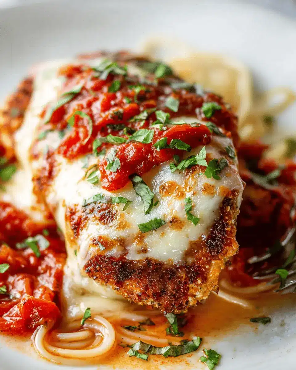To elevate your presentation, place the Chicken Parmesan on a bed of pasta, drizzling extra marinara sauce artistically on the plate. Garnish with freshly chopped basil or parsley for a pop of color. For a more casual vibe, serve in a rustic cast-iron skillet. These small touches can turn a simple meal into a culinary experience!