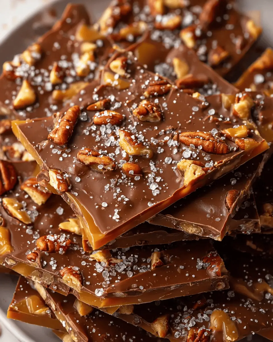 If you want to get creative, sprinkle some chopped pecans or any toppings you like (think crushed candy canes for a festive twist!). Once you’ve added your toppings, let the entire tray cool. You can either leave it at room temperature or speed things up by placing it in the fridge until it firms up completely. When it’s cool and hard, break it into bite-sized pieces and serve!