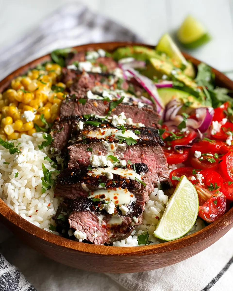 Finally, the moment you’ve been waiting for—assembling your cilantro lime steak bowls! Start with a base of 4 cups of cooked rice or riced cauliflower in each bowl. Top with sliced steak, 2 sliced avocados, 1 can of heated black beans, 1 can of heated corn, and a sprinkle of 1 cup of shredded cheddar cheese. Add some diced ½ red onion for an extra crunch. Finish it off with a generous drizzle of lime crema, and voila! You have a meal that’s not only delicious but visually appealing as well.
