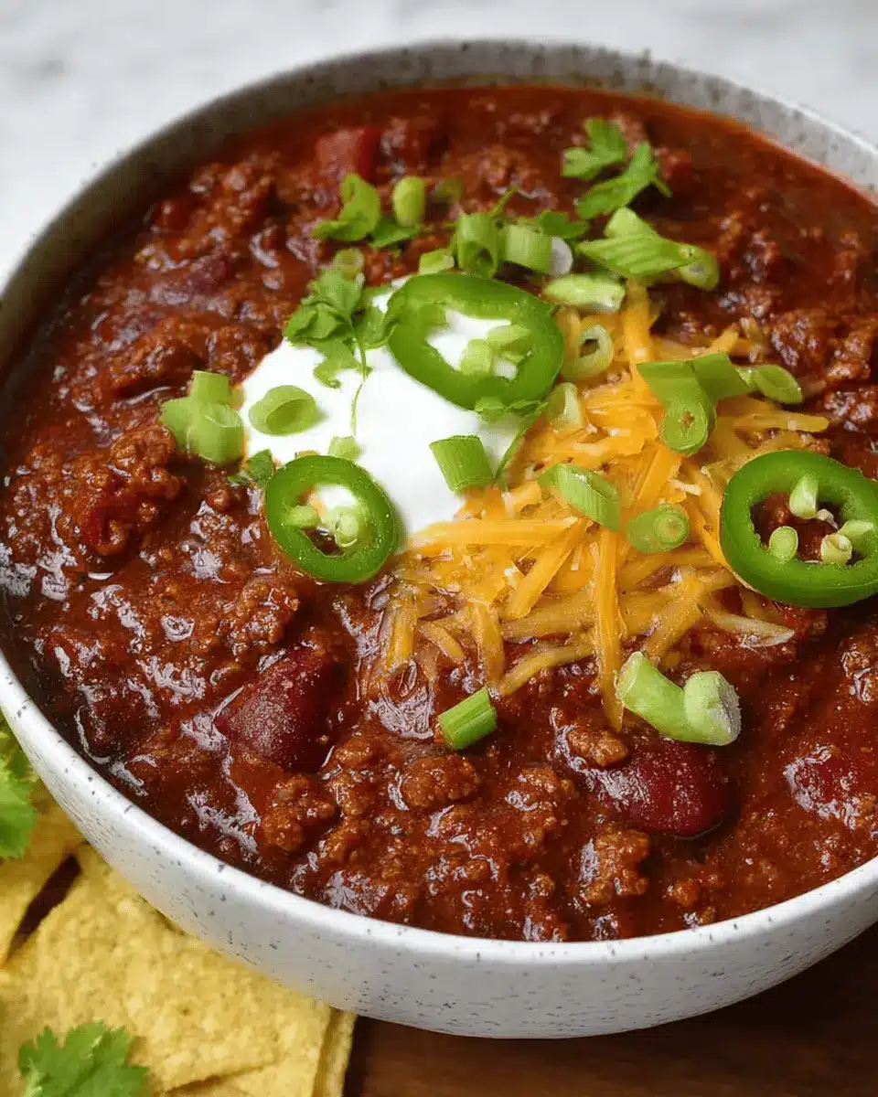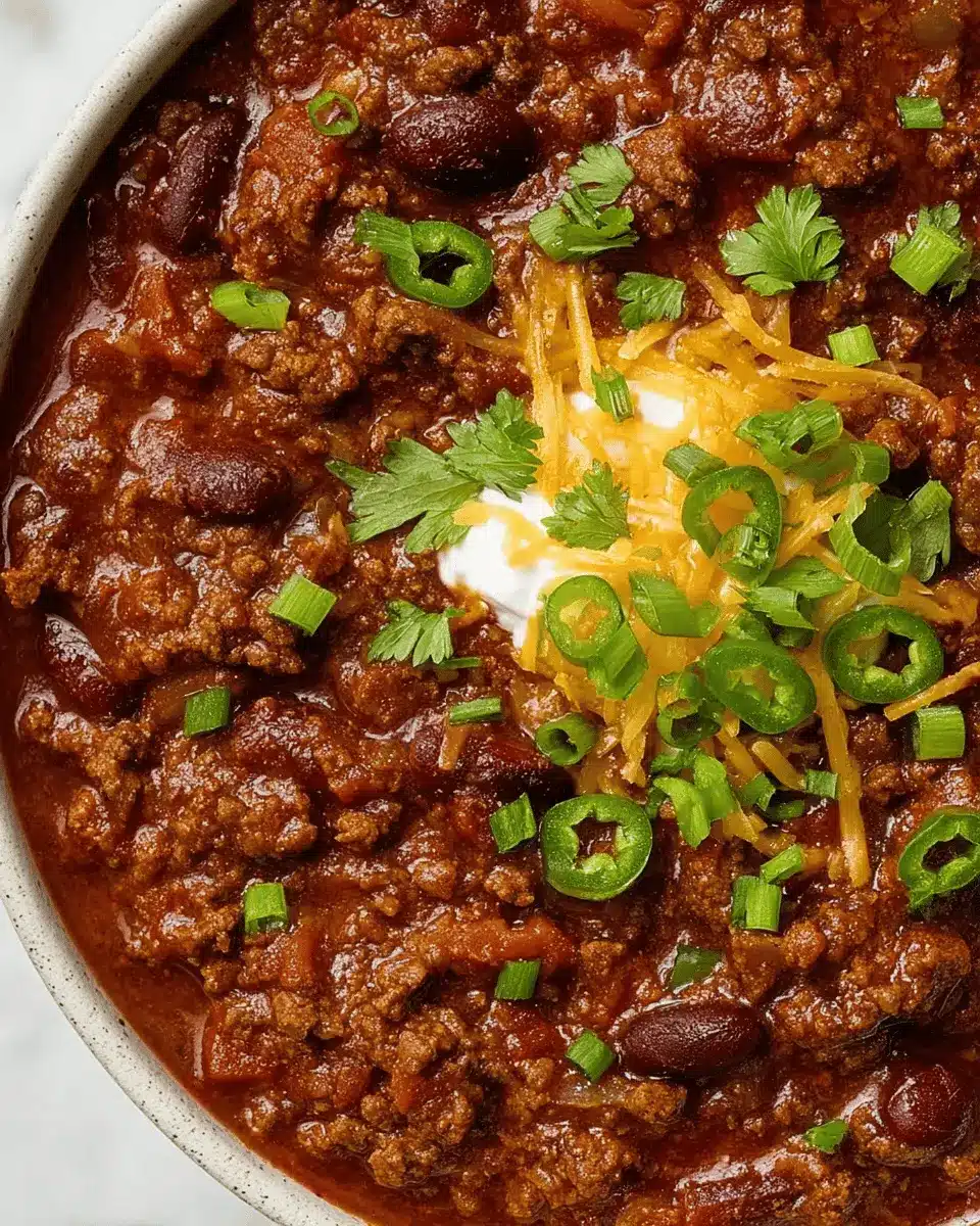 Elevate your classic beef chili experience with perfect pairings. Try topping your hearty bowl with a dollop of sour cream or plain Greek yogurt for creaminess. Shredded cheddar cheese adds a melty richness, while thinly sliced scallions provide a nice crunch and mild onion flavor. For a refreshing twist, dice some avocado and sprinkle fresh cilantro on top—both add a lovely creaminess and herbaceous note that balance the spices in your chili.