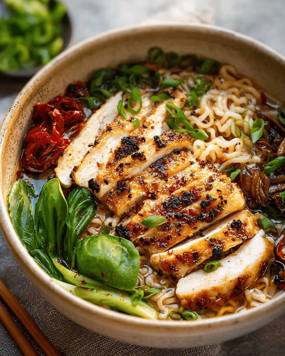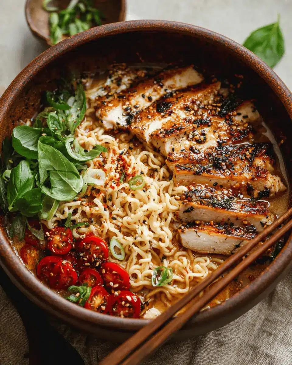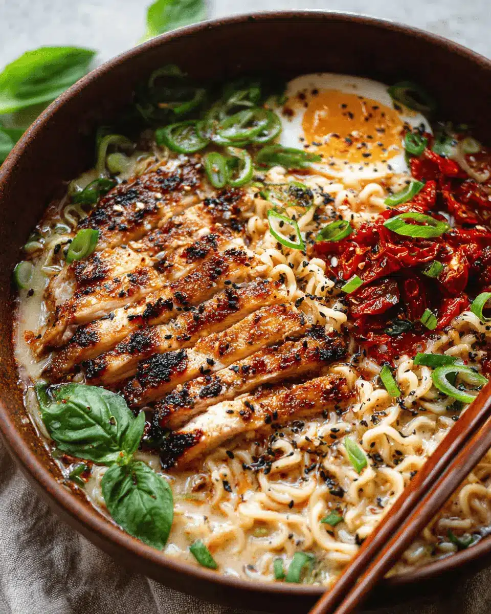 Imagine succulent chicken infused with a blend of Italian herbs, simmered in a rich, creamy broth filled with sun-dried tomatoes and fresh basil. Each bite of tender chicken paired with perfectly cooked ramen noodles creates a symphony of flavors that delight the senses. Whether you’re cooking for a relaxing evening at home or aiming to impress someone special, this ramen is sure to captivate.