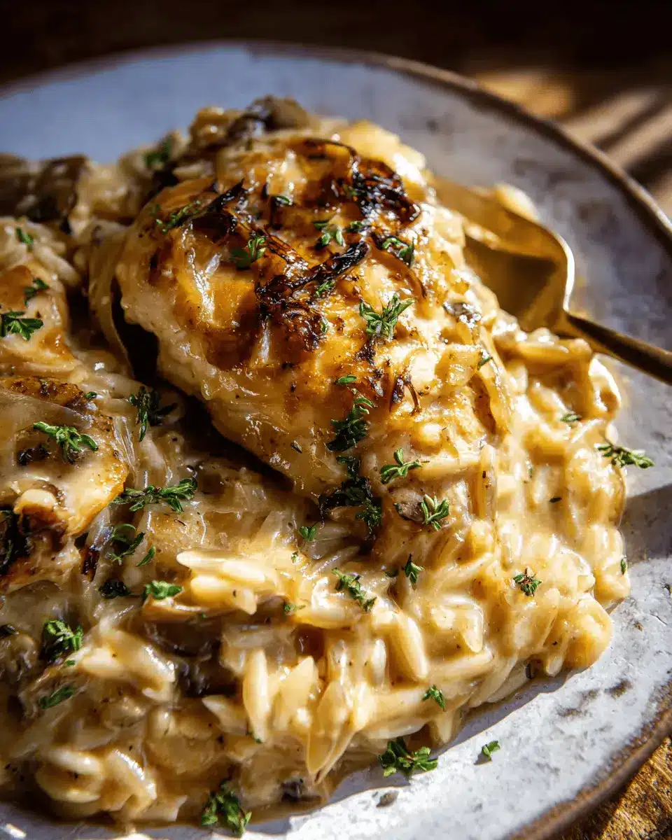 To take your Crockpot Creamy French Onion Chicken and Orzo to the next level, preheat your oven’s broiler to high. Return the chicken and onions to the sheet pan, adding more butter and topping with some additional cheese if you like. Broil for 3-5 minutes until the cheese is melted and golden brown. This crispy finish adds a delightful crunch to each bite, contrasting wonderfully with the creamy orzo.
