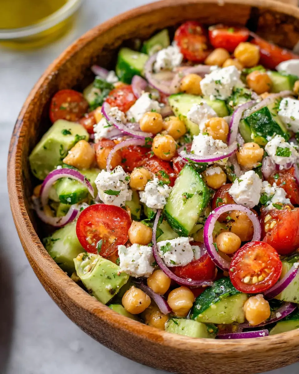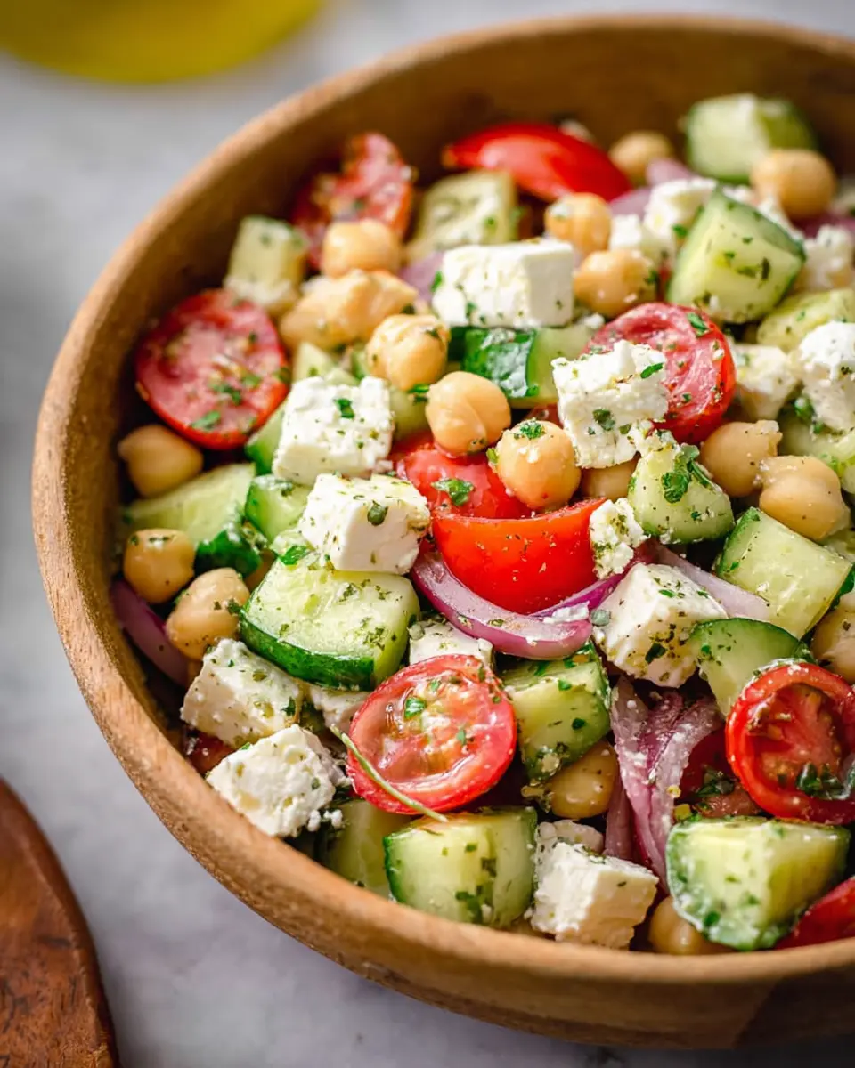 Absolutely! One of the best things about this easy chickpea feta salad is its versatility. Feel free to swap in your favorite veggies like bell peppers or add some leafy greens for extra crunch. If you’re not a fan of feta, try a vegan cheese alternative, or simply leave it out. Spices like cumin or smoked paprika can also give it a unique flavor twist.