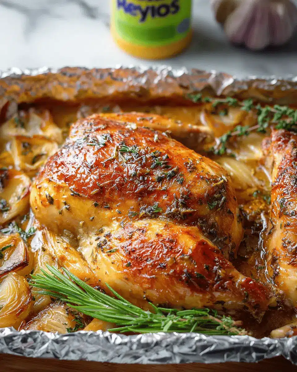 Once everything is assembled, place your dish in the preheated oven and let it do its magic! Roast the chicken, uncovered, for about 1 hour, until the skin turns golden brown and crispy. To ensure everything is cooked perfectly, check that the internal temperature reaches 165°F (74°C). Want even crispier skin? Try turning on the oven broiler for the last 5–7 minutes—just keep a close watch to avoid burning!
