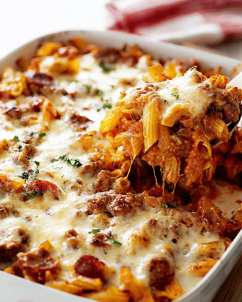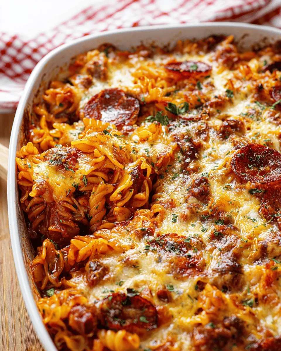 Customize your easy pizza pasta bake to fit your taste! Experiment with different marinara sauces, like spicy arrabbiata or a classic tomato-basil blend. Want extra heat? Toss in red pepper flakes or jalapeños. Prefer a milder version? Opt for a creamy sauce or add more cheese. The beauty of this recipe is its flexibility—make it your own!