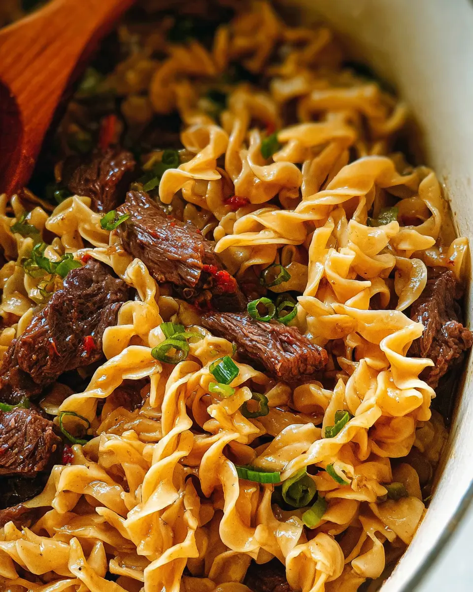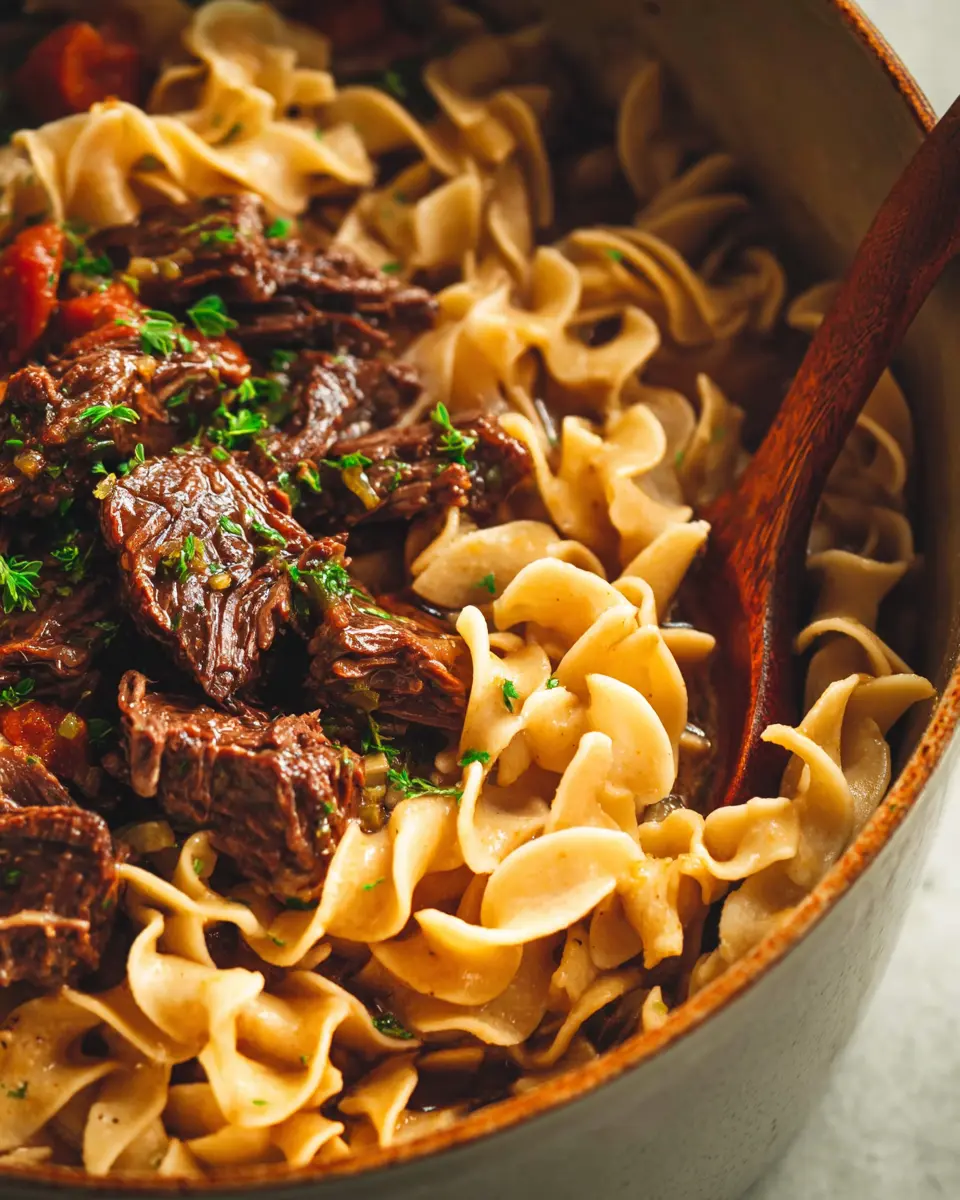 With your noodles perfectly cooked, remove the pot from heat, and stir in the shredded beef. Taste and adjust the seasoning with additional salt and pepper as desired. This is your moment to make it just right!