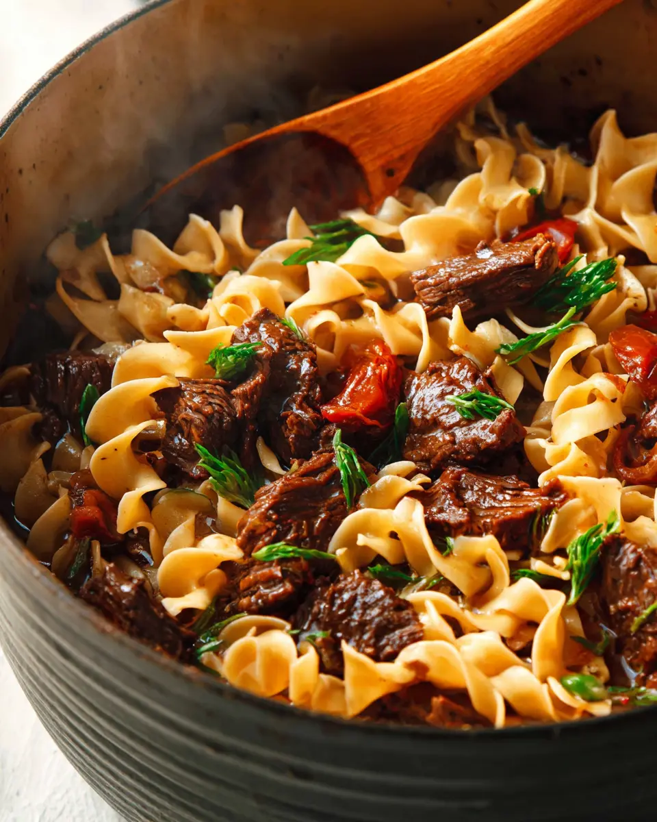 Now it’s time for the noodles! Add the remaining 2 cups of beef stock back to the pot and increase the heat to high. Once it reaches a rolling boil, toss in 12 ounces of wide egg noodles. Stir occasionally and cook until they’re al dente—this usually takes about 6-8 minutes. 🌟