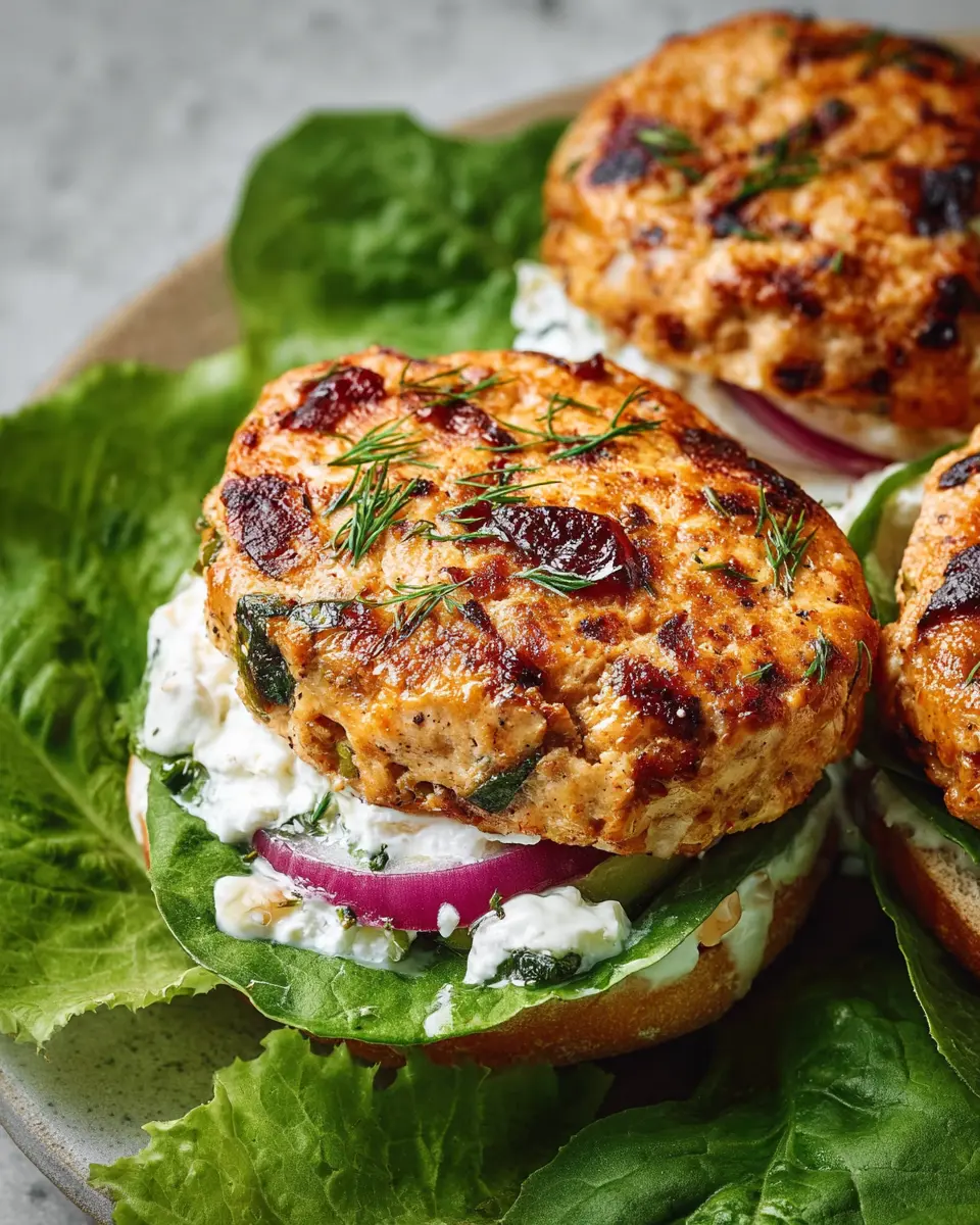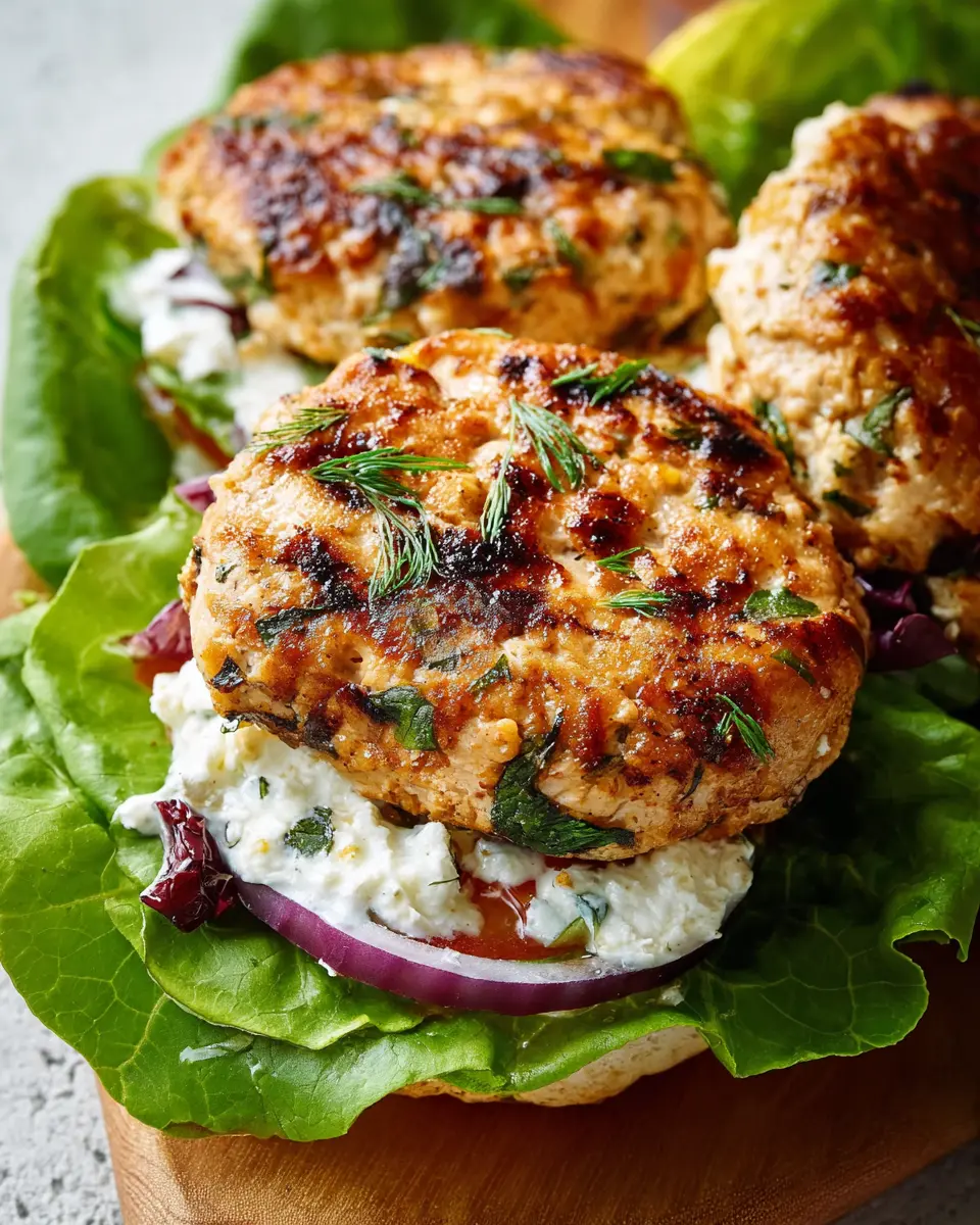 Finally, it’s time to assemble your Greek Chicken Burgers! Start with a layer of butter lettuce on a bun or plate, add the cooked patties, and finish with your favorite toppings—don’t skimp on the tzatziki sauce and crumbled feta for that authentic Greek experience!