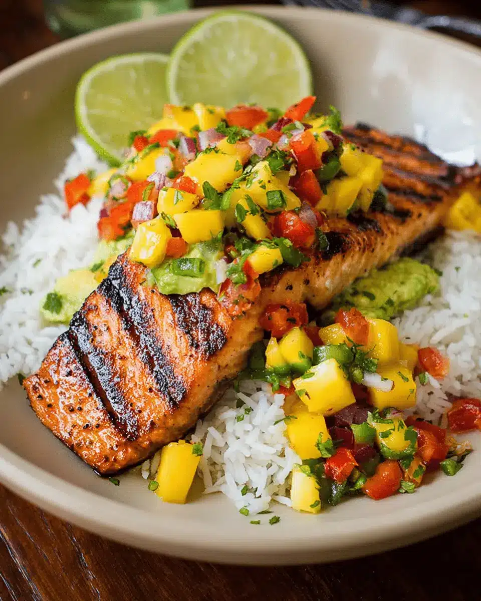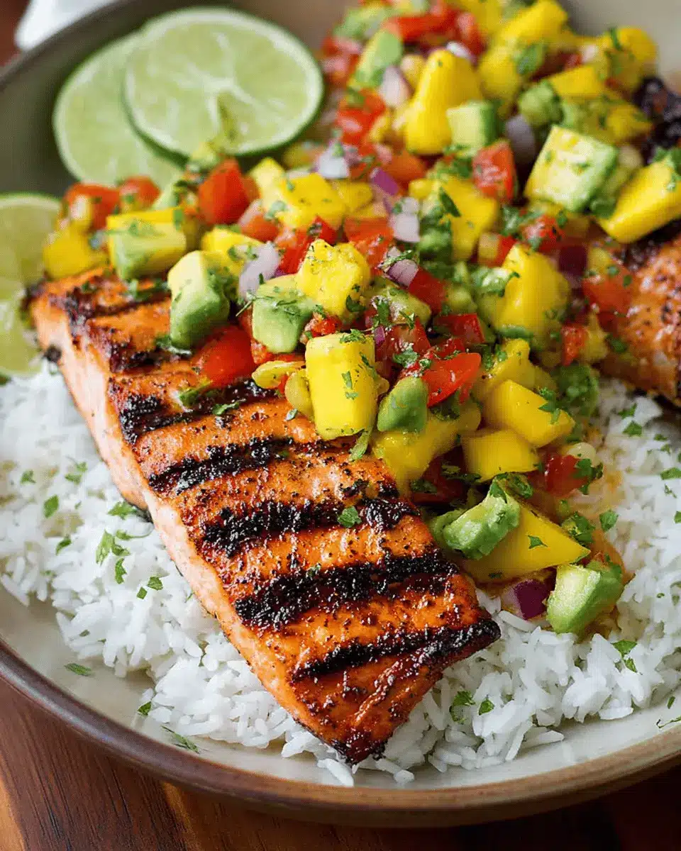 Grilled Lime Salmon with Avocado-Mango Salsa and Coconut Rice
