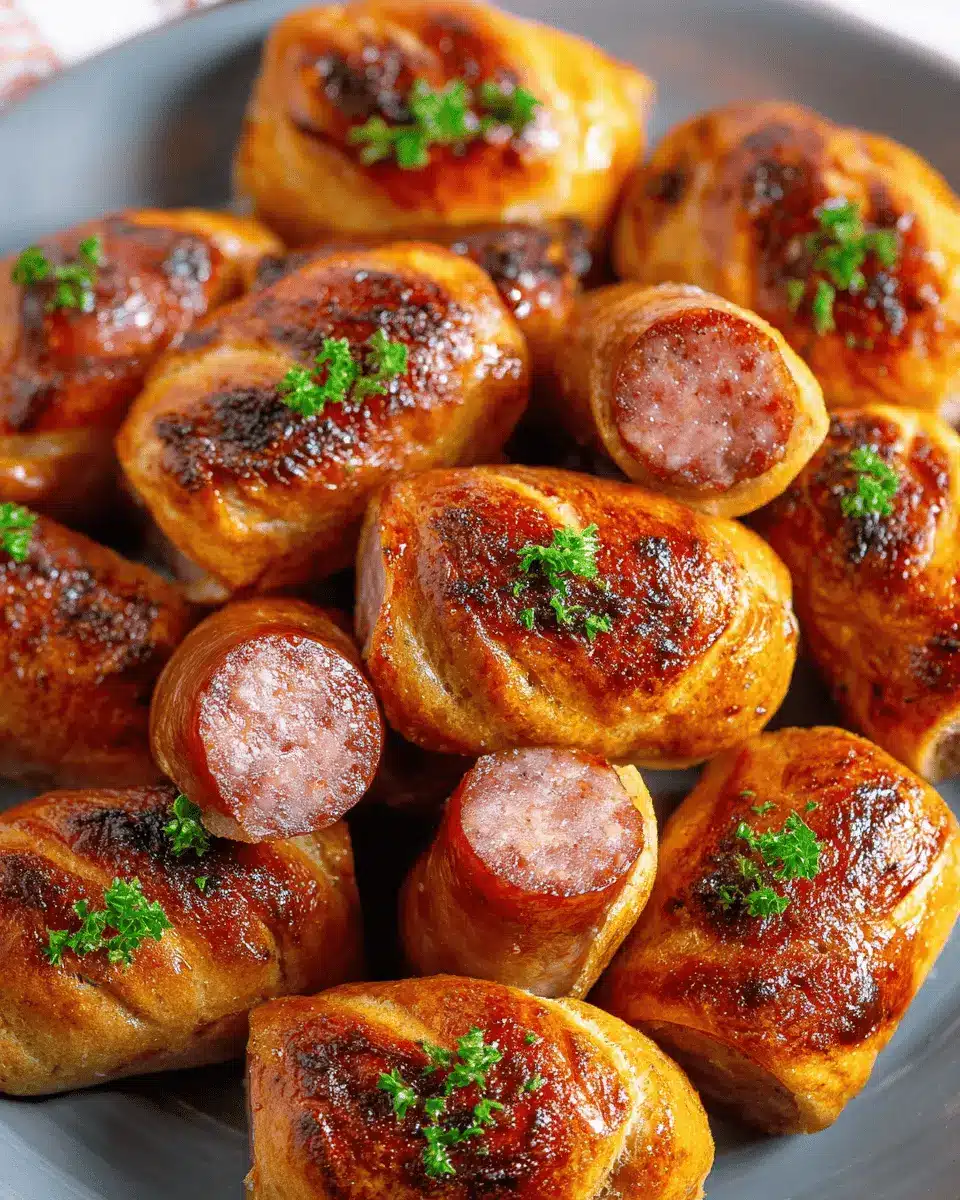 To ensure your Kilted Sausage Bites come out with a perfect crisp, avoid soggy bottoms by using a preheated baking sheet. Adding a bit of cornmeal or flour beneath the dough can also help keep things dry. Make sure the crescent roll dough is tightly wrapped around the sausage to prevent moisture from seeping in.