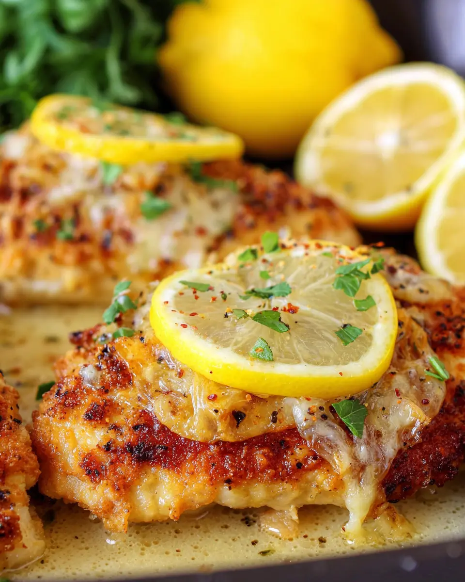 Now for the finishing touch! Preheat your oven to 350ºF and line a baking sheet with parchment paper. Place the cooked chicken breasts on the sheet and combine ½ cup of shredded Mozzarella cheese with ½ cup of shredded Monterey Jack cheese in a bowl. Add a small mound of this cheesy mix on top of each chicken breast. Bake for approximately 13–15 minutes, or until the internal temperature reaches 165ºF. Just before serving, spritz juice from a lemon wedge over each piece, and don’t forget to garnish with fresh parsley and lemon slices for that extra pop of color and flavor!