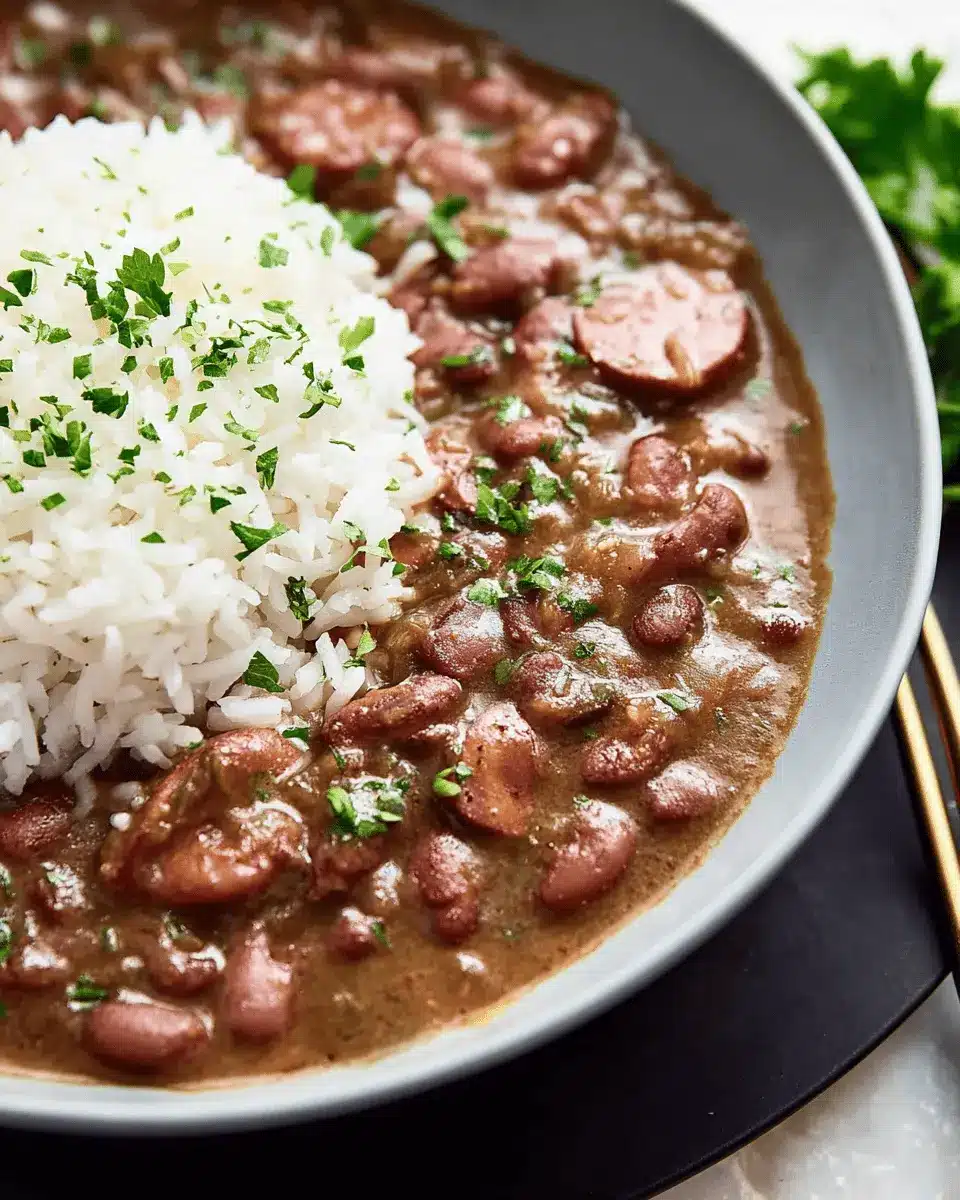 Elevate your dish by serving Louisiana Style Red Beans and Rice in wide, shallow bowls. Add a sprinkle of fresh green onions or chopped parsley for a pop of color. For a rustic touch, consider garnishing with a wedge of lemon—its bright acidity enhances the savory flavors beautifully.