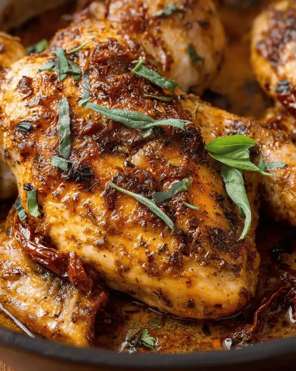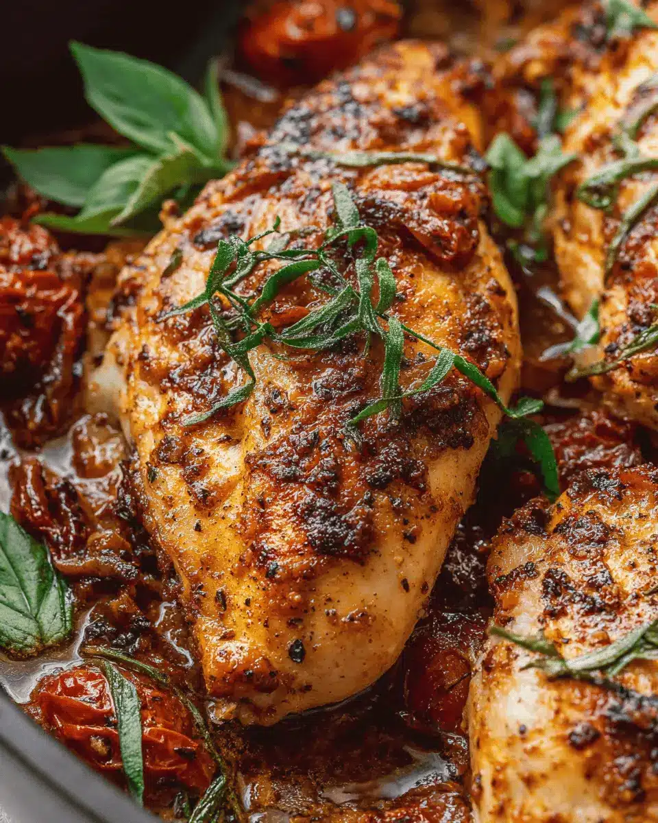 Now that your delicious sauce is bubbling away, return the chicken to the skillet. Quickly flip each piece 2 to 3 times to fully coat it in that beautiful sauce. Transfer the entire skillet to your preheated oven and bake for 15 minutes. Keep an eye on it and use a meat thermometer to check for doneness — aim for an internal temperature of 160°F (71°C). After removing it from the oven, let the chicken rest for about 5 minutes before plating. Spoon that heavenly sauce over your chicken and garnish with 2 tablespoons of fresh basil. Serve this delightful dish hot, and watch as it becomes a family favorite!