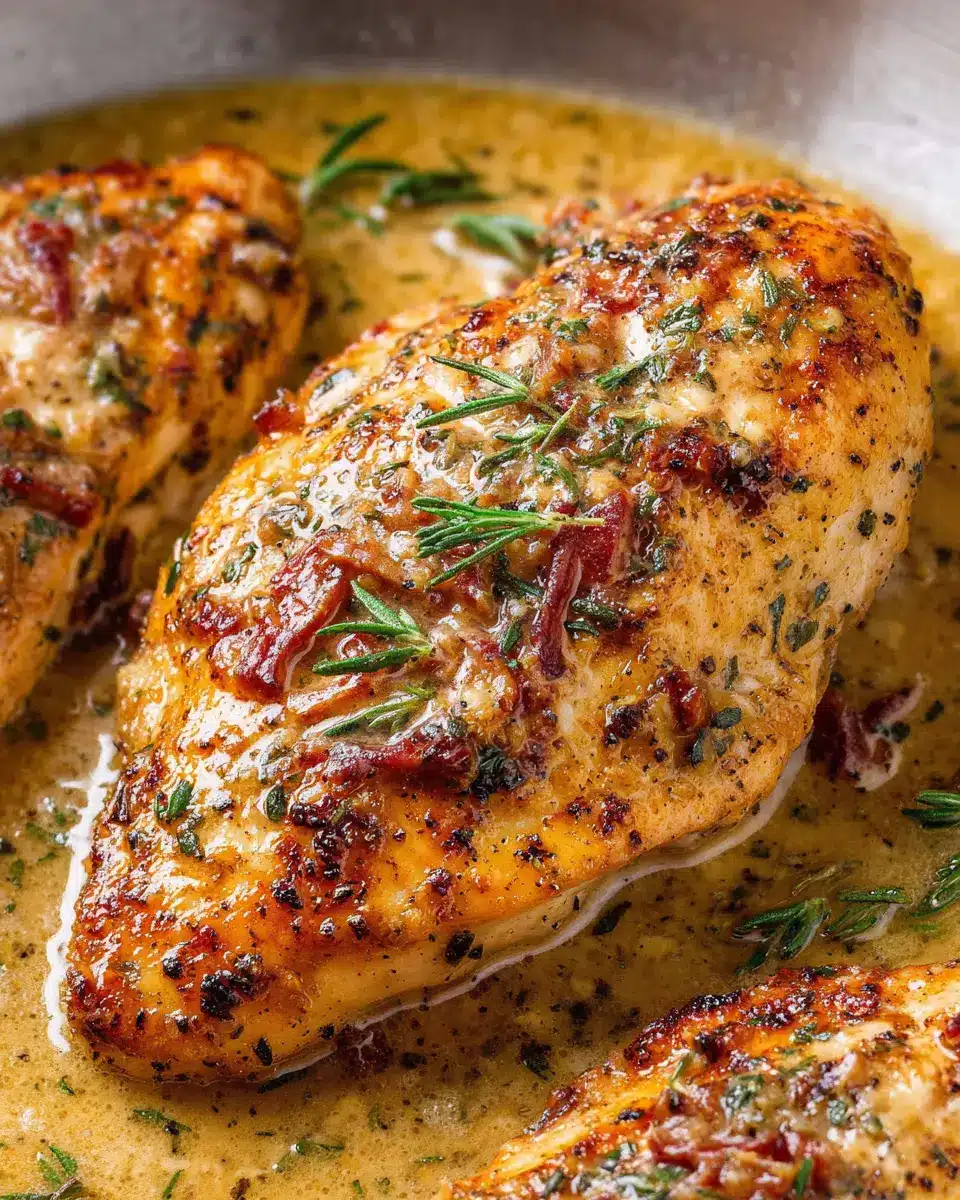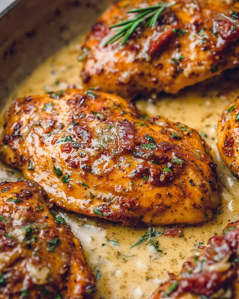 Take your browned chicken and gently return it to the skillet, allowing it to soak up all that creamy goodness. Add ⅓ cup of chopped sundried tomatoes, and let it simmer for a few more minutes—just enough time for the chicken to warm through and the sauce to thicken further.