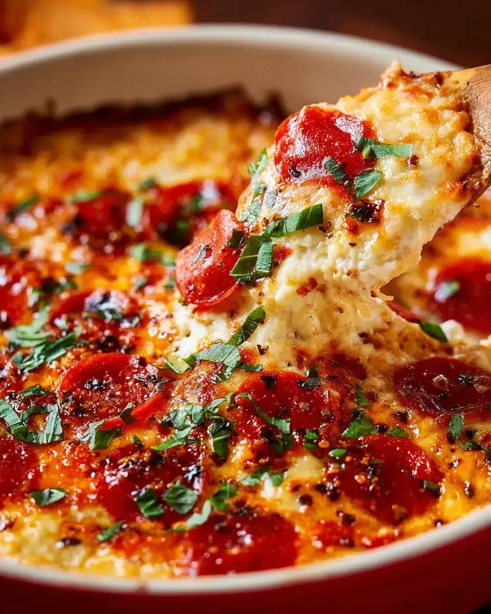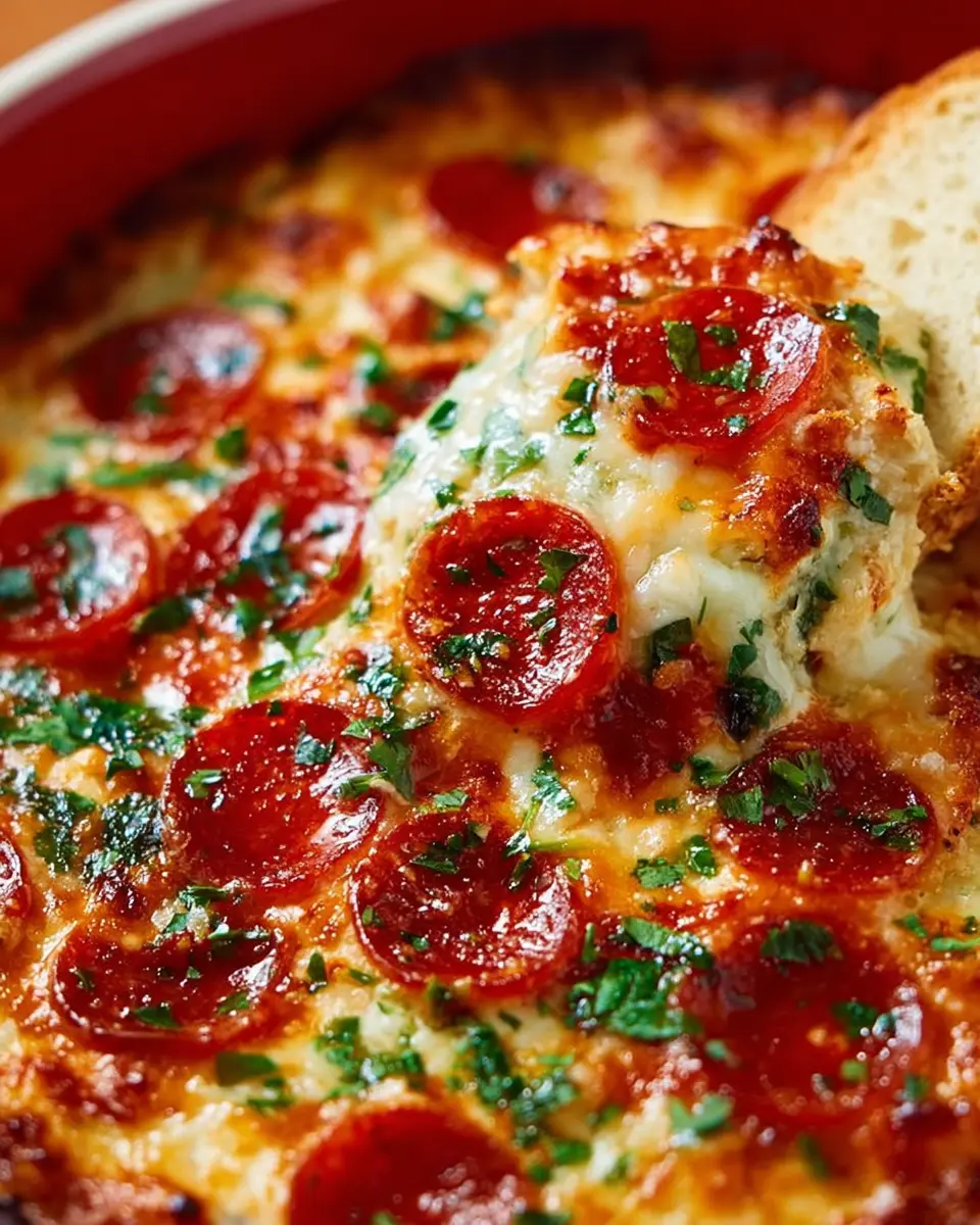 Finally, it’s time to indulge. Bake your luscious pizza dip in the preheated oven for 25-30 minutes, or until the top turns golden brown and bubbly. As it bakes, your kitchen will fill with an irresistible aroma that’ll have everyone gathering around! For a finishing touch, consider garnishing with extra red pepper flakes or a sprinkle of chopped parsley for a pop of color.