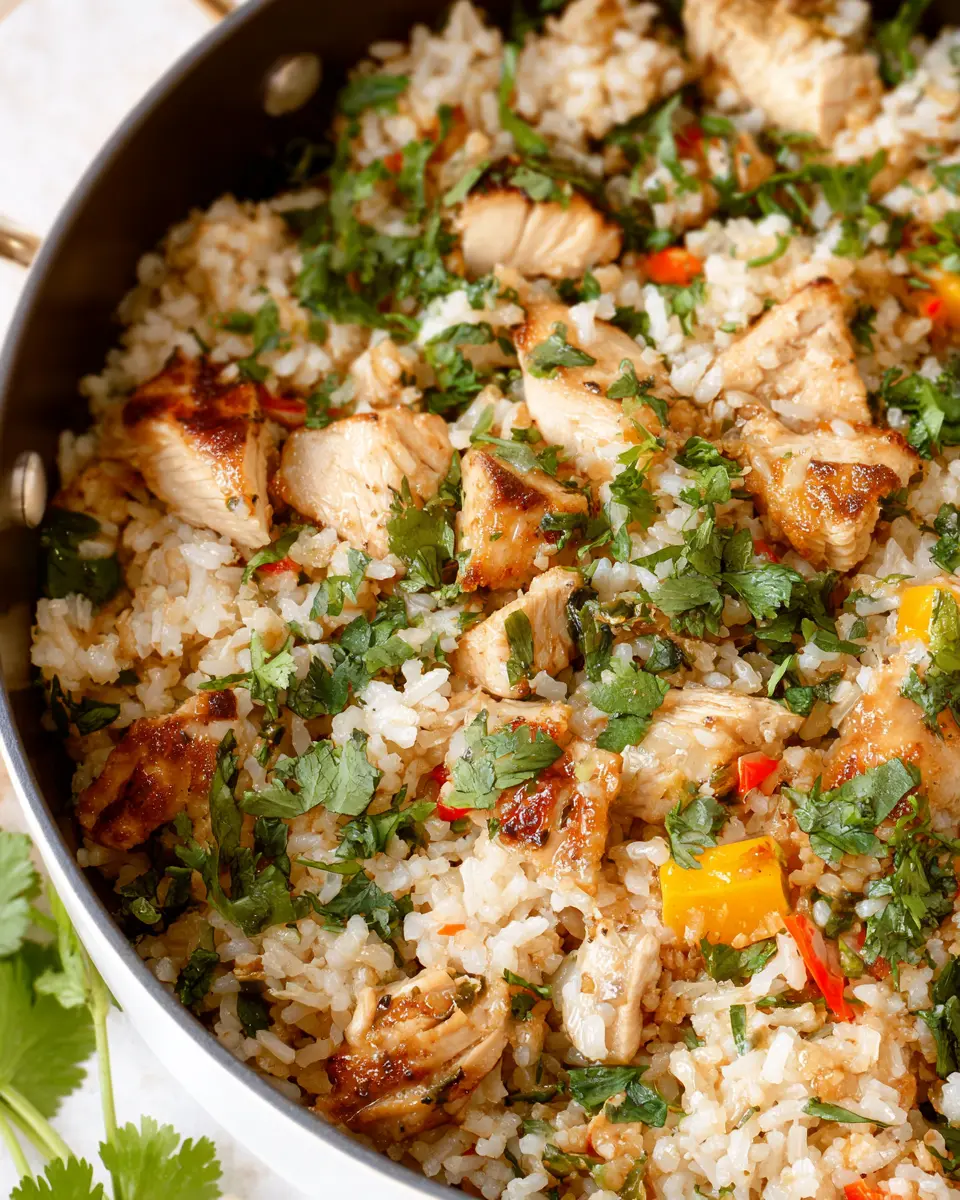 Next, add your rinsed basmati or jasmine rice (1.5 cups) to the pot, stirring well to coat it with the aromatic oil. Now we’re ready to add the real magic! Pour in 1.75 cups of low-sodium chicken broth and one can of full-fat coconut milk (13.5 oz). Toss in chopped yellow bell peppers, ½ cup of roasted cashews, and the green and white parts of 3 scallions, seasoning with the remaining salt and pepper. Be sure to scrape up those browned bits from the bottom—you don’t want to miss out on that flavor! Nestle the browned chicken back on top, along with any juices from the plate.