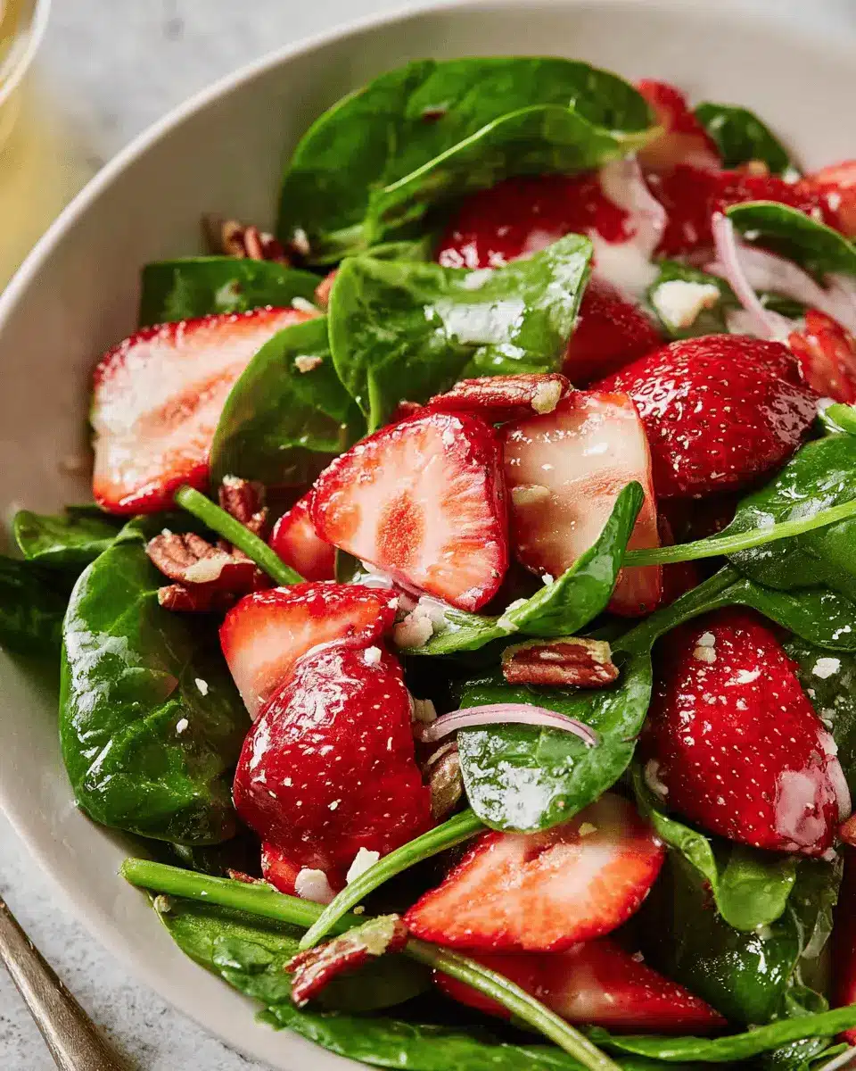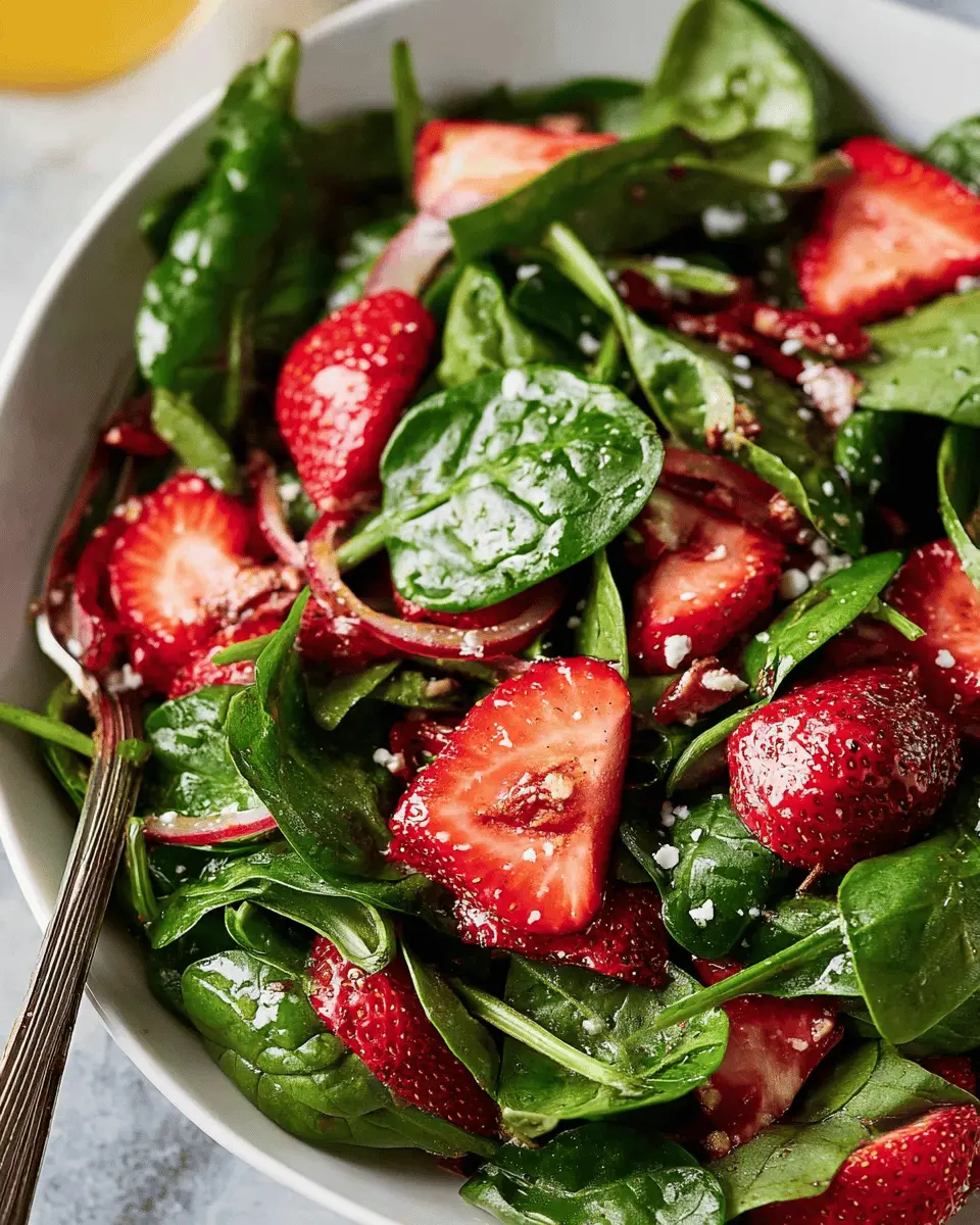 When selecting strawberries for your strawberry spinach salad, look for firm, plump berries that have a vibrant red color. Avoid any that feel mushy or have dark patches. A quick tip? Always smell them—ripe strawberries have a sweet, fruity aroma. For the freshest taste, try to buy local, in-season strawberries from farmer’s markets or nearby farms!