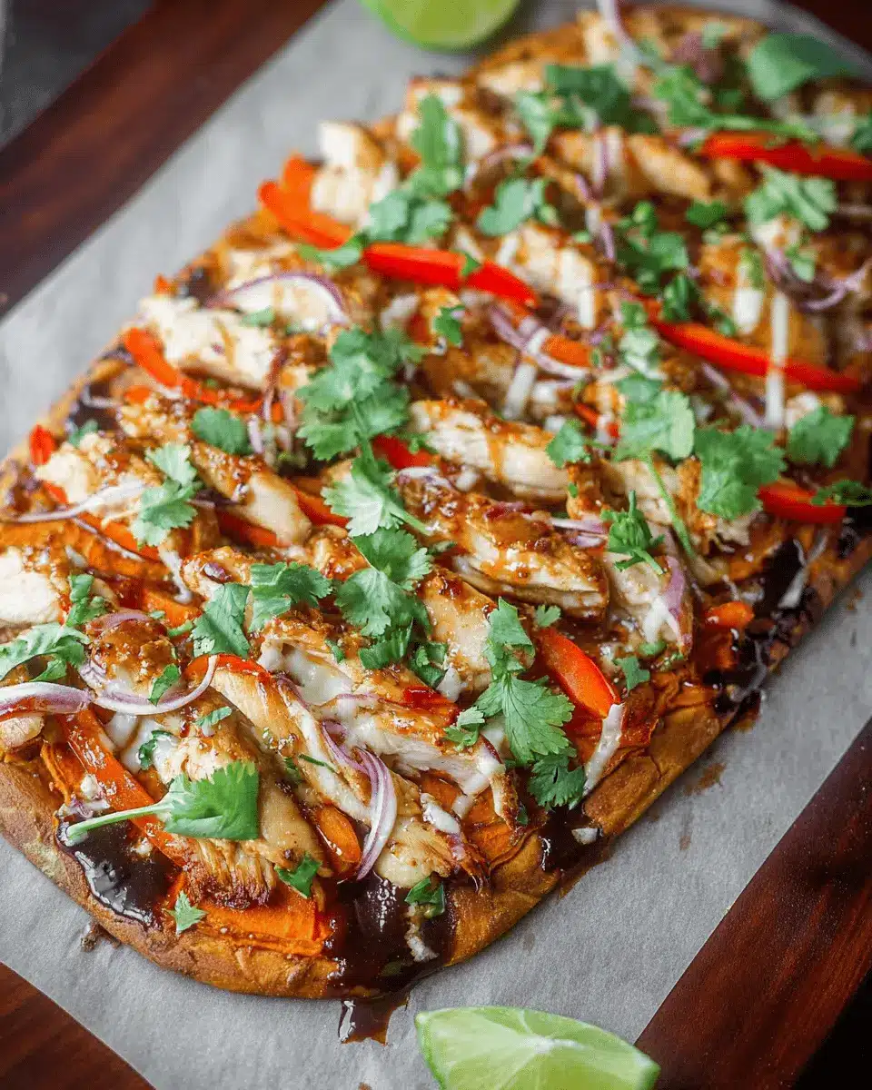 After your flatbread has baked and cooled slightly, it’s time to have some fun! Spread the almond dressing evenly over the cooled flatbread. This step not only enhances the flavor but also ensures every bite is succulent. Now, add your toppings: sliced chicken breast, thinly grated carrot, sliced red pepper, and fresh cilantro leaves. Don’t forget to brush a light coat of olive oil over the top to enhance that golden-brown finish!