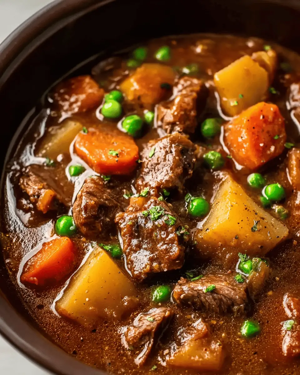 In the last 15 minutes, toss in the frozen peas for that pop of color and sweetness. Remove the bay leaves and rosemary sprig (nobody wants to chew on those). For those who love a thicker stew, mix ¼ cup of cold water with 3 tablespoons of cornstarch to create a slurry and stir it into the pot. Just like that, your stew will begin to thicken beautifully!
