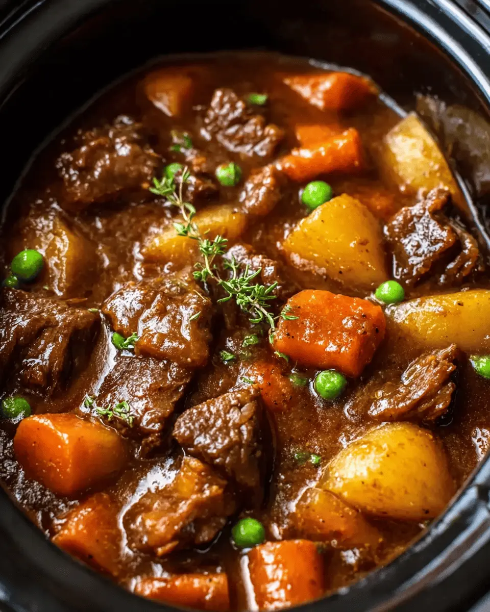Now it’s time to create that flavorful stew! Add the rest of your ingredients—except the peas and cornstarch mixture—to the slow cooker. Mix everything well, ensuring it’s nicely blended. Cover your crockpot and let it work its magic for 7½ to 8 hours on low or 3½ to 4 hours on high. Your kitchen will smell incredible as everything simmers together, waiting for those veggies to soften and potatoes to become fork-tender.